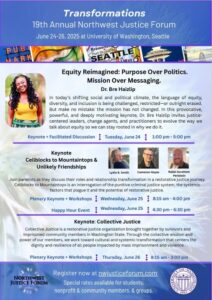 The NW Justice Forum fosters the gathering of individuals committed to, or interested in learning about, the principles and values of Restorative Justice. This year, the Forum is highlighting how restorative justice is a catalyst for TRANSFORMATIONS in individuals, in communities and the world.