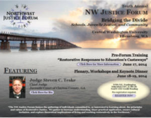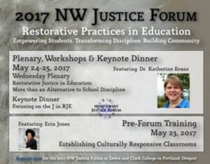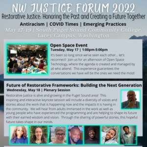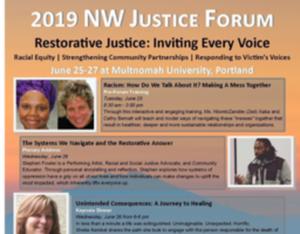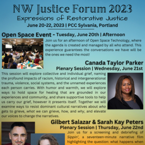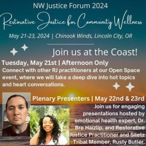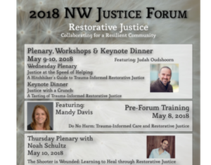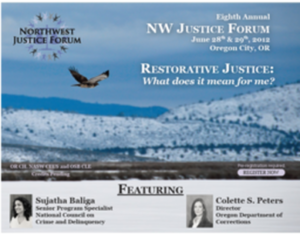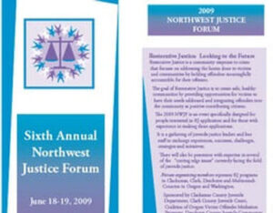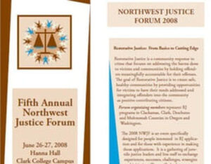 The Northwest Justice Forum began in 2004 with a by-invitation only event to gather people committed to restorative justice in order to encourage and support each other in efforts to implement restorative justice practices in the Pacific Northwest. Denny Maloney, the Director of Deschutes County Juvenile Court at the time, contacted Eric Gilman at Clark County Juvenile Court with an interest in starting a restorative justice focused conference, and the seed was planted. Planning members from Deschutes County, Clark County, and Clackamas County Juvenile Courts, along with Resolutions Northwest and interested community partners came together to start what is now an annual tradition, open to all with an interest in this philosophy and practice.
